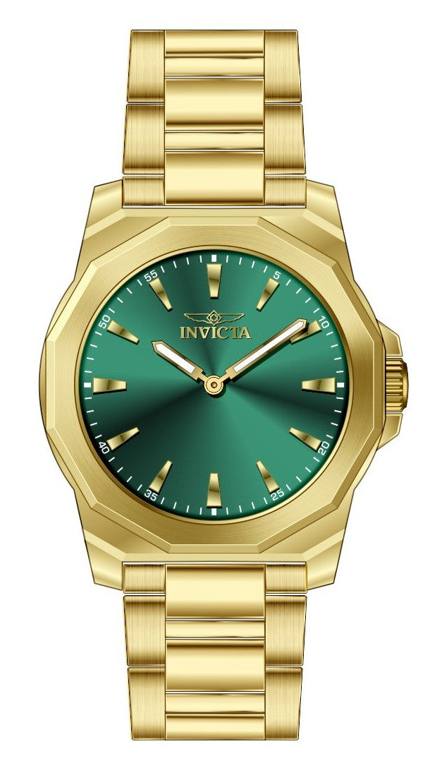 Band Material: Stainless Steel, Band Tone: Gold, Band Width: 22MM, Band Length: 180MM, Crown Type: Push, Case Material: Stainless Steel, Case Tone: Gold, Case Size [mm]: 42, Case Back: Solid, Material of Hands: Brass, Color of Hands: Gold,Luminous, Crystal Type: Mineral, Bezel Material: None, Dial Material: Brass, Dial Color: Green, Dial Pattern: Sun-ray Finish .Purchasing these parts and having a non-authorized repair center open your watch voids all manufacturing warranties. Invicta cannot guarantee the quality standards of an altered timepiece, the standard 3-year limited warranty on Invicta timepieces shall be invalid if the timepiece is serviced at any time by an unauthorized repair center. This includes battery replacements, which must be done at an Invicta authorized repair center in order to maintain the eligibility of the warranty. Please follow the link below to learn more about Invicta's warranty.https://cdn.invictawatch.com/www/files/invicta-warranty-2018.pdf