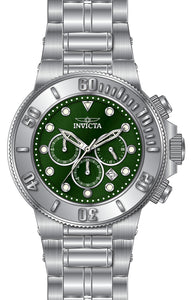 Band Material: Stainless Steel, Band Tone: Steel, Band Width: 30MM, Band Length: 210MM, Crown Type: Push, Case Material: Stainless Steel, Case Tone: Steel, Case Size [mm]: 52.00, Case Back: Solid, Material of Hands: Metal, Color of Hands: Silver,Luminous, Crystal Type: Mineral, Bezel Material: Stainless Steel, Dial Material: Metal, Dial Color: Green, Dial Pattern: Sun-ray Finish .Purchasing these parts and having a non-authorized repair center open your watch voids all manufacturing warranties. Invicta cannot guarantee the quality standards of an altered timepiece, the standard 3-year limited warranty on Invicta timepieces shall be invalid if the timepiece is serviced at any time by an unauthorized repair center. This includes battery replacements, which must be done at an Invicta authorized repair center in order to maintain the eligibility of the warranty. Please follow the link below to learn more about Invicta's warranty.https://cdn.invictawatch.com/www/files/invicta-warranty-2018.pdf