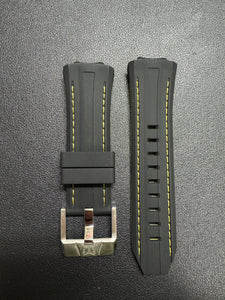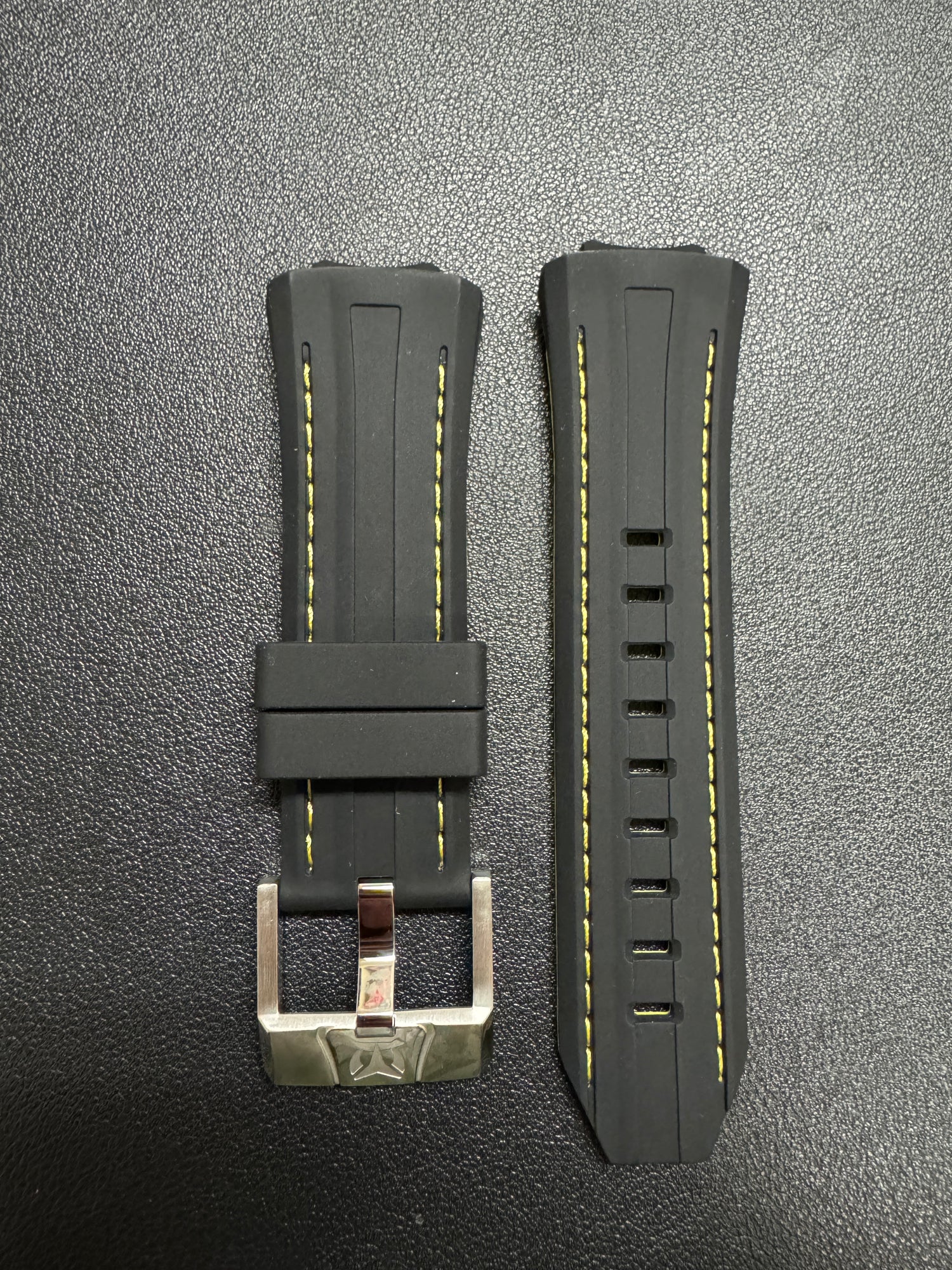 Band Material: Silicone, Band Tone: Black, Yellow, Band Size: 29mm, Band Length: 210mm, Clasp Type: Regular, Clasp Tone: Stainless Steel Please note that bands do not ship with spring bars or T bars. If you need these parts, please add them to your cart with the corresponding part sku.