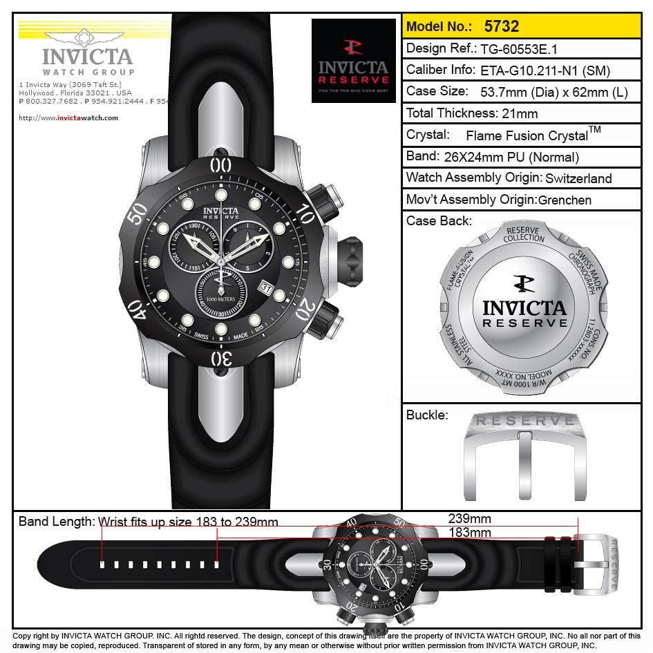 Individual Spare PARTS For Men Invicta Venom 5732, Band Material Stainless Steel, Polyurethane, Band Color Black, Steel, Band Width 26 MM, Band Length 210 MM, Buckle Type Regular, Clasp Type Regular, Crown Type Screw Down, Case Material Stainless Steel, Case Tone Steel, Black, Case Size (mm) 53.7, Case Back Solid, Material of Hands Metal, Color of Hands Luminous, Steel, Crystal Type Flame Fusion, Bezel Material Stainless Steel, Dial Material Metal, Dial Color Black, Dial Pattern .Purchasing these parts and having a non-authorized repair center open your watch voids all manufacturing warranties. Invicta cannot guarantee the quality standards of an altered timepiece, the standard 3-year limited warranty on Invicta timepieces shall be invalid if the timepiece is serviced at any time by an unauthorized repair center. This includes battery replacements, which must be done at an Invicta authorized repair center in order to maintain the eligibility of the warranty. Please follow the link below to learn more about Invicta's warranty.https://cdn.invictawatch.com/www/files/invicta-warranty-2018.pdf