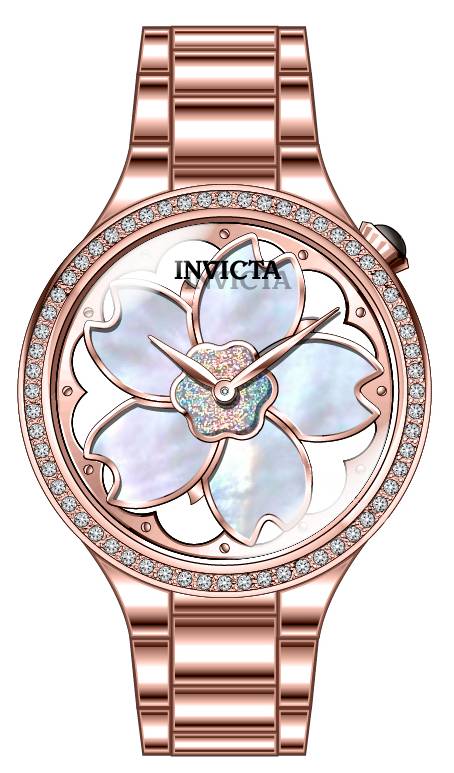 Band Material: Stainless Steel, Band Tone: Rose Gold, Band Width: 16MM, Band Length: 175MM, Crown Type: Push, Case Material: Stainless Steel, Case Tone: Rose Gold, Case Size [mm]: 35, Case Back: Solid, Material of Hands: Metal, Color of Hands: Rose Gold, Crystal Type: Flame Fusion, Bezel Material: Stainless Steel,Crystal, Dial Material: Metal,Mother of Pearl, Dial Color: White,Rose Gold .Purchasing these parts and having a non-authorized repair center open your watch voids all manufacturing warranties. Invicta cannot guarantee the quality standards of an altered timepiece, the standard 3-year limited warranty on Invicta timepieces shall be invalid if the timepiece is serviced at any time by an unauthorized repair center. This includes battery replacements, which must be done at an Invicta authorized repair center in order to maintain the eligibility of the warranty. Please follow the link below to learn more about Invicta's warranty.https://cdn.invictawatch.com/www/files/invicta-warranty-2018.pdf
