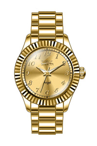 INVICTA Angel Lady 36mm Stainless Steel Gold Gold dial PC21 Quartz , Band Material: Stainless Steel, Band Tone: Gold, Band Size [mm]: 18, Band Length [mm]: 172.5, Buckle Type: Fold over push button , Crown Type : Push, Case Material : Stainless Steel, Case Tone : Gold, Case Size (mm) : 36, Case Back : Solid, Material of Hands : Metal, Color of Hands : White,Gold, Crystal Type : Flame Fusion, Bezel Material : Stainless Steel, Dial Material : Metal, Dial Color : Gold, Dial Pattern : Sun-ray Finish .Purchasing these parts and having a non-authorized repair center open your watch voids all manufacturing warranties. Invicta cannot guarantee the quality standards of an altered timepiece, the standard 3-year limited warranty on Invicta timepieces shall be invalid if the timepiece is serviced at any time by an unauthorized repair center. This includes battery replacements, which must be done at an Invicta authorized repair center in order to maintain the eligibility of the warranty. Please follow the link below to learn more about Invicta's warranty.https://cdn.invictawatch.com/www/files/invicta-warranty-2018.pdf
