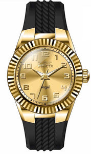 INVICTA Angel Lady 36mm Stainless Steel Gold Gold dial PC21 Quartz , Band Material: Silicone, Band Tone: Black, Band Size [mm]: 18, Band Length [mm]: 172.5, Buckle Type: Buckle , Crown Type : Push, Case Material : Stainless Steel, Case Tone : Gold, Case Size (mm) : 36, Case Back : Solid, Material of Hands : Metal, Color of Hands : White,Gold, Crystal Type : Flame Fusion, Bezel Material : Stainless Steel, Dial Material : Metal, Dial Color : Gold, Dial Pattern : Sun-ray Finish .Purchasing these parts and having a non-authorized repair center open your watch voids all manufacturing warranties. Invicta cannot guarantee the quality standards of an altered timepiece, the standard 3-year limited warranty on Invicta timepieces shall be invalid if the timepiece is serviced at any time by an unauthorized repair center. This includes battery replacements, which must be done at an Invicta authorized repair center in order to maintain the eligibility of the warranty. Please follow the link below to learn more about Invicta's warranty.https://cdn.invictawatch.com/www/files/invicta-warranty-2018.pdf