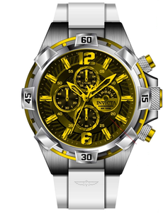 INVICTA Aviator Men 50.5mm Stainless Steel Silver Black dial VD56 Quartz , Band Material: Silicone, Band Tone: White, Band Size [mm]: 26, Band Length [mm]: 210, Buckle Type: Buckle , Crown Type : Push, Case Material : Stainless Steel, Case Tone : Silver, Case Size (mm) : 50.5, Case Back : Solid, Material of Hands : Metal, Color of Hands : White,Gunmetal, Crystal Type : Flame Fusion, Bezel Material : Stainless Steel, Dial Material : Metal, Dial Color : Black, Dial Pattern : Sun-ray Finish .Purchasing these parts and having a non-authorized repair center open your watch voids all manufacturing warranties. Invicta cannot guarantee the quality standards of an altered timepiece, the standard 3-year limited warranty on Invicta timepieces shall be invalid if the timepiece is serviced at any time by an unauthorized repair center. This includes battery replacements, which must be done at an Invicta authorized repair center in order to maintain the eligibility of the warranty. Please follow the link below to learn more about Invicta's warranty.https://cdn.invictawatch.com/www/files/invicta-warranty-2018.pdf