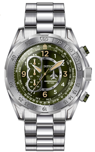 Band Material: Stainless Steel, Band Tone: Steel, Band Width: 26MM, Band Length: 197MM, Crown Type: Push, Case Material: Stainless Steel, Case Tone: Silver, Case Size [mm]: 51.5, Case Back: Solid, Material of Hands: Metal, Color of Hands: Silver,Ivory, Crystal Type: Flame Fusion, Bezel Material: Stainless Steel, Dial Material: Stainless Steel, Dial Color: Green, Dial Pattern: Sun-ray Finish .Purchasing these parts and having a non-authorized repair center open your watch voids all manufacturing warranties. Invicta cannot guarantee the quality standards of an altered timepiece, the standard 3-year limited warranty on Invicta timepieces shall be invalid if the timepiece is serviced at any time by an unauthorized repair center. This includes battery replacements, which must be done at an Invicta authorized repair center in order to maintain the eligibility of the warranty. Please follow the link below to learn more about Invicta's warranty.https://cdn.invictawatch.com/www/files/invicta-warranty-2018.pdf