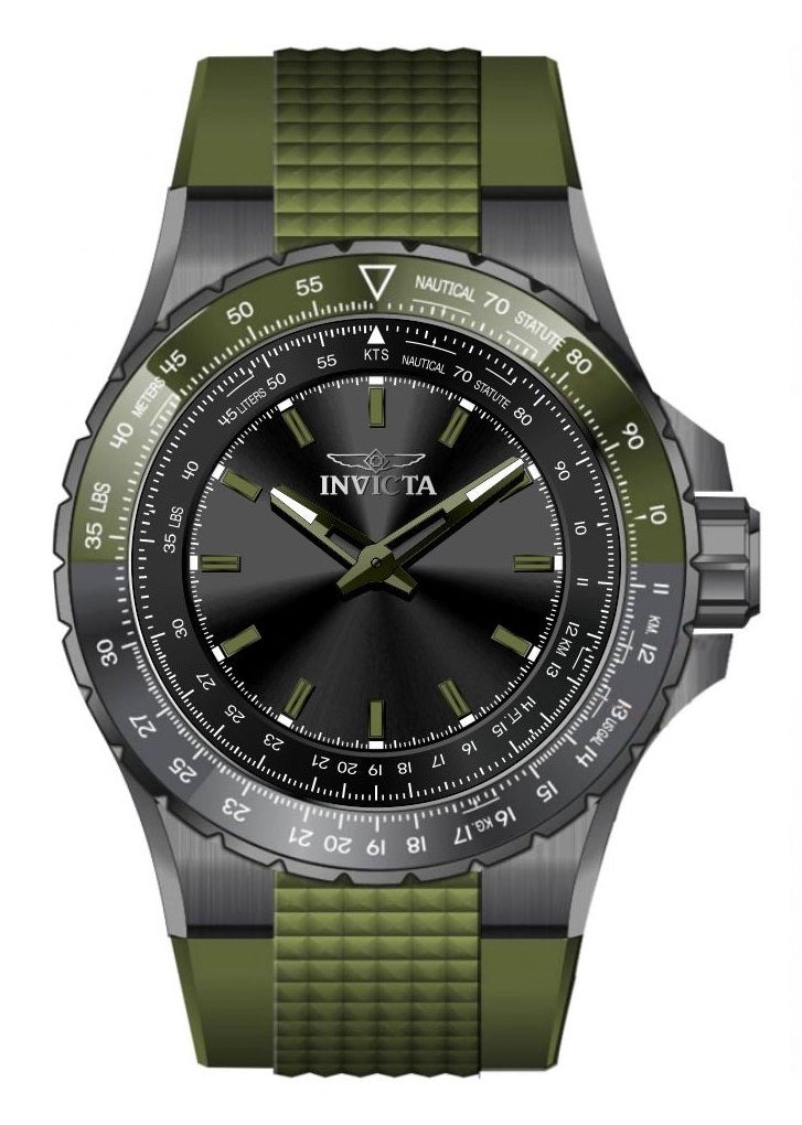 Band Material: Silicone, Band Tone: Green, Band Width: 32.5MM, Band Length: 225MM, Crown Type: Push, Case Material: Stainless Steel, Case Tone: Gunmetal, Case Size [mm]: 50, Case Back: Solid, Material of Hands: Brass, Color of Hands: Green,Luminous, Crystal Type: Mineral, Bezel Material: Stainless Steel,Aluminum, Dial Material: Brass, Dial Color: Black, Dial Pattern: Sun-ray Finish .Purchasing these parts and having a non-authorized repair center open your watch voids all manufacturing warranties. Invicta cannot guarantee the quality standards of an altered timepiece, the standard 3-year limited warranty on Invicta timepieces shall be invalid if the timepiece is serviced at any time by an unauthorized repair center. This includes battery replacements, which must be done at an Invicta authorized repair center in order to maintain the eligibility of the warranty. Please follow the link below to learn more about Invicta's warranty.https://cdn.invictawatch.com/www/files/invicta-warranty-2018.pdf