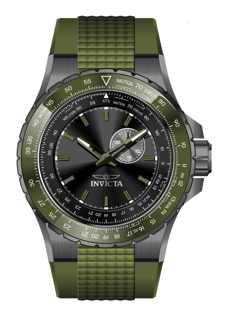 Band Material: Silicone, Band Tone: Green, Band Width: 32.5MM, Band Length: 225MM, Crown Type: Push, Case Material: Stainless Steel, Case Tone: Gunmetal, Case Size [mm]: 50, Case Back: Solid, Material of Hands: Brass, Color of Hands: Green,Luminous, Crystal Type: Mineral, Bezel Material: Stainless Steel,Aluminum, Dial Material: Brass, Dial Color: Black, Dial Pattern: Sun-ray Finish .Purchasing these parts and having a non-authorized repair center open your watch voids all manufacturing warranties. Invicta cannot guarantee the quality standards of an altered timepiece, the standard 3-year limited warranty on Invicta timepieces shall be invalid if the timepiece is serviced at any time by an unauthorized repair center. This includes battery replacements, which must be done at an Invicta authorized repair center in order to maintain the eligibility of the warranty. Please follow the link below to learn more about Invicta's warranty.https://cdn.invictawatch.com/www/files/invicta-warranty-2018.pdf