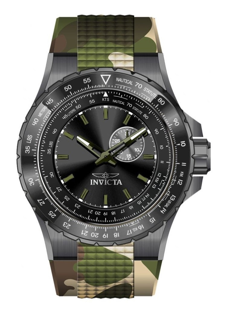 Band Material: Silicone, Band Tone: Camouflage, Band Width: 32.5MM, Band Length: 225MM, Crown Type: Push, Case Material: Stainless Steel, Case Tone: Gunmetal, Case Size [mm]: 50, Case Back: Solid, Material of Hands: Brass, Color of Hands: Green,Luminous, Crystal Type: Mineral, Bezel Material: Stainless Steel,Aluminum, Dial Material: Brass, Dial Color: Black, Dial Pattern: Sun-ray Finish .Purchasing these parts and having a non-authorized repair center open your watch voids all manufacturing warranties. Invicta cannot guarantee the quality standards of an altered timepiece, the standard 3-year limited warranty on Invicta timepieces shall be invalid if the timepiece is serviced at any time by an unauthorized repair center. This includes battery replacements, which must be done at an Invicta authorized repair center in order to maintain the eligibility of the warranty. Please follow the link below to learn more about Invicta's warranty.https://cdn.invictawatch.com/www/files/invicta-warranty-2018.pdf