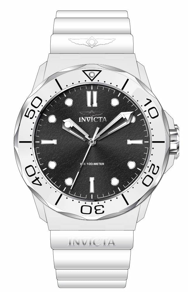 Band Material: Silicone, Band Tone: White, Band Width: 24MM, Band Length: 215MM, Crown Type: Push, Case Material: ABS, Case Tone: White, Case Size [mm]: 45, Case Back: Solid, Material of Hands: Metal, Color of Hands: Silver, Crystal Type: Flame Fusion, Bezel Material: Aluminum,ABS, Dial Material: Metal, Dial Color: Black, Dial Pattern: Sandblast Finish .Purchasing these parts and having a non-authorized repair center open your watch voids all manufacturing warranties. Invicta cannot guarantee the quality standards of an altered timepiece, the standard 3-year limited warranty on Invicta timepieces shall be invalid if the timepiece is serviced at any time by an unauthorized repair center. This includes battery replacements, which must be done at an Invicta authorized repair center in order to maintain the eligibility of the warranty. Please follow the link below to learn more about Invicta's warranty.https://cdn.invictawatch.com/www/files/invicta-warranty-2018.pdf