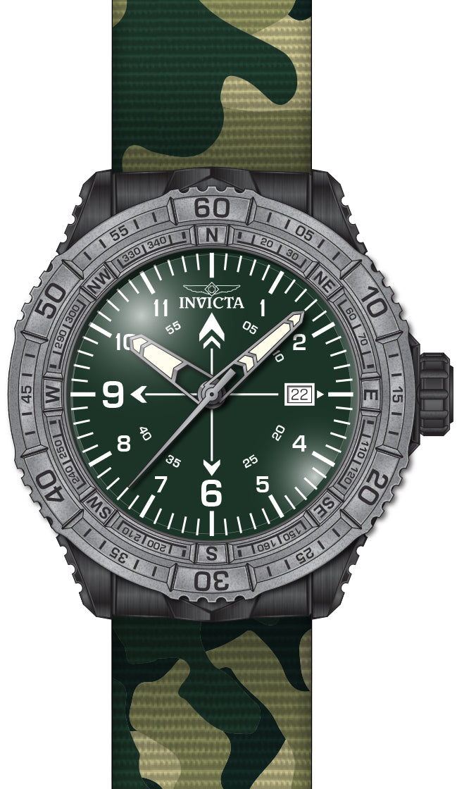 Band Material: Nylon, Band Tone: Green,Camouflage, Band Width: 24MM, Band Length: 190MM, Crown Type: Push, Case Material: Stainless Steel, Case Tone: Black,Titanium,Sandblast, Case Size [mm]: 50.00, Case Back: Solid screwed, Material of Hands: Metal, Color of Hands: Silver,Luminous, Crystal Type: Mineral, Bezel Material: Stainless Steel, Dial Material: Metal,Matte, Dial Color: Dark Green, Dial Pattern: Matte Finish .Purchasing these parts and having a non-authorized repair center open your watch voids all manufacturing warranties. Invicta cannot guarantee the quality standards of an altered timepiece, the standard 3-year limited warranty on Invicta timepieces shall be invalid if the timepiece is serviced at any time by an unauthorized repair center. This includes battery replacements, which must be done at an Invicta authorized repair center in order to maintain the eligibility of the warranty. Please follow the link below to learn more about Invicta's warranty.https://cdn.invictawatch.com/www/files/invicta-warranty-2018.pdf