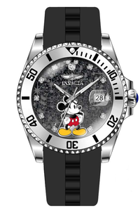 INVICTA Disney Limited Edition Lady 38mm Stainless Steel Silver Black dial PC32 Quartz , Band Material: Silicone, Band Tone: Black, Band Size [mm]: 20, Band Length [mm]: 200, Buckle Type: Buckle , Crown Type : Push, Case Material : Stainless Steel, Case Tone : Silver, Case Size (mm) : 38, Case Back : Solid, Material of Hands : Metal, Color of Hands : White,Silver, Crystal Type : Flame Fusion, Bezel Material : Stainless Steel, Dial Material : Glitter, Dial Color : Black .Purchasing these parts and having a non-authorized repair center open your watch voids all manufacturing warranties. Invicta cannot guarantee the quality standards of an altered timepiece, the standard 3-year limited warranty on Invicta timepieces shall be invalid if the timepiece is serviced at any time by an unauthorized repair center. This includes battery replacements, which must be done at an Invicta authorized repair center in order to maintain the eligibility of the warranty. Please follow the link below to learn more about Invicta's warranty.https://cdn.invictawatch.com/www/files/invicta-warranty-2018.pdf