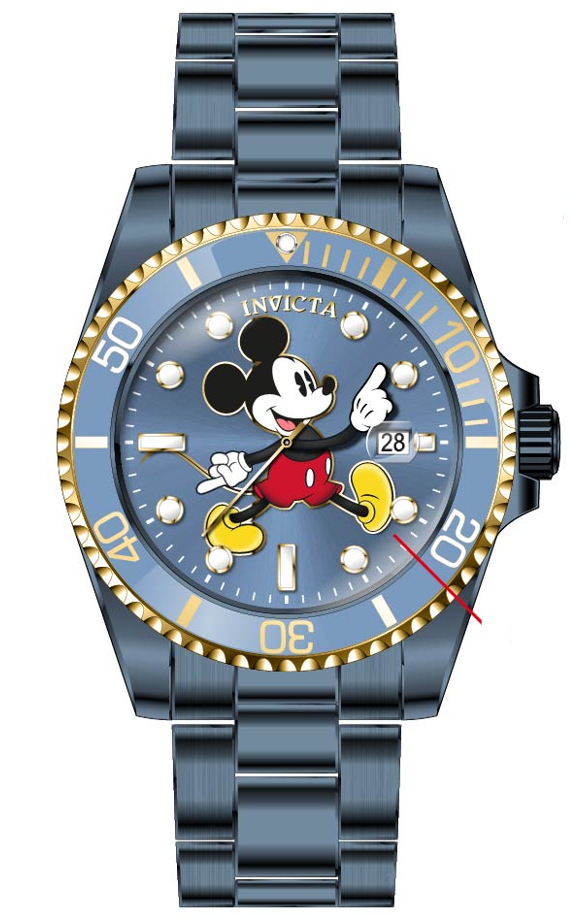 INVICTA Disney Limited Edition Men 40mm Stainless Steel Blue Black+Blue+White+Red+Yellow dial PC32 Quartz , Band Material: Stainless Steel, Band Tone: Blue, Band Size [mm]: 20, Band Length [mm]: 200, Buckle Type: Fold over safety , Crown Type : Push, Case Material : Stainless Steel, Case Tone : Blue, Case Size (mm) : 40, Case Back : Solid, Material of Hands : Metal, Color of Hands : Gold, Crystal Type : Flame Fusion, Bezel Material : Stainless Steel, Dial Material : Metal, Dial Color : Black,Blue,White,Red,Yellow, Dial Pattern : Sun-ray Finish .Purchasing these parts and having a non-authorized repair center open your watch voids all manufacturing warranties. Invicta cannot guarantee the quality standards of an altered timepiece, the standard 3-year limited warranty on Invicta timepieces shall be invalid if the timepiece is serviced at any time by an unauthorized repair center. This includes battery replacements, which must be done at an Invicta authorized repair center in order to maintain the eligibility of the warranty. Please follow the link below to learn more about Invicta's warranty.https://cdn.invictawatch.com/www/files/invicta-warranty-2018.pdf