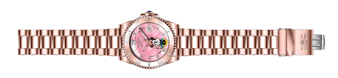 INVICTA Disney Limited Edition Lady 38mm Stainless Steel Rose Gold Pink dial PC32 Quartz , Band Material: Stainless Steel, Band Tone: Rose Gold, Band Size [mm]: 20, Band Length [mm]: 180, Buckle Type: Fold over safety , Crown Type : Push, Case Material : Stainless Steel, Case Tone : Rose Gold, Case Size (mm) : 38, Case Back : Solid, Material of Hands : Metal, Color of Hands : White,Rose Gold, Crystal Type : Flame Fusion, Bezel Material : Stainless Steel, Dial Material : Mother of Pearl, Dial Color : Pink .Purchasing these parts and having a non-authorized repair center open your watch voids all manufacturing warranties. Invicta cannot guarantee the quality standards of an altered timepiece, the standard 3-year limited warranty on Invicta timepieces shall be invalid if the timepiece is serviced at any time by an unauthorized repair center. This includes battery replacements, which must be done at an Invicta authorized repair center in order to maintain the eligibility of the warranty. Please follow the link below to learn more about Invicta's warranty.https://cdn.invictawatch.com/www/files/invicta-warranty-2018.pdf