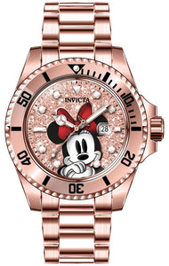 INVICTA Disney Limited Edition Lady 36mm Stainless Steel Rose Gold Rose Gold dial PC22A Quartz , Band Material: Stainless Steel, Band Tone: Rose Gold, Band Size [mm]: 17, Band Length [mm]: 175, Buckle Type: Fold over safety , Crown Type : Push, Case Material : Stainless Steel, Case Tone : Rose Gold, Case Size (mm) : 36, Case Back : Solid, Material of Hands : Metal, Color of Hands : White,Rose Gold, Crystal Type : Flame Fusion, Bezel Material : Stainless Steel,Aluminum, Dial Material : Glitter, Dial Color : Rose Gold .Purchasing these parts and having a non-authorized repair center open your watch voids all manufacturing warranties. Invicta cannot guarantee the quality standards of an altered timepiece, the standard 3-year limited warranty on Invicta timepieces shall be invalid if the timepiece is serviced at any time by an unauthorized repair center. This includes battery replacements, which must be done at an Invicta authorized repair center in order to maintain the eligibility of the warranty. Please follow the link below to learn more about Invicta's warranty.https://cdn.invictawatch.com/www/files/invicta-warranty-2018.pdf