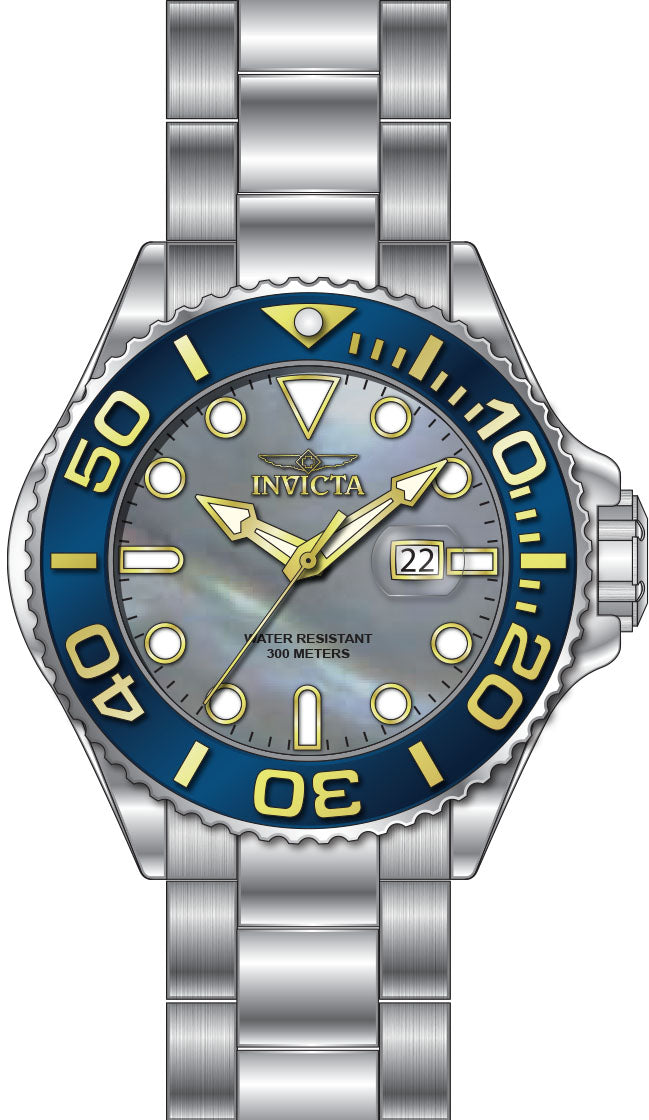 Band Material: Stainless Steel, Band Tone: Steel, Band Width: 24MM, Band Length: 210MM, Crown Type: Screw Down, Case Material: Stainless Steel,Aluminum, Case Tone: Gold,Blue,Steel, Case Size [mm]: 52.00, Case Back: Solid screwed, Material of Hands: Metal, Color of Hands: Gold,Luminous, Crystal Type: Mineral, Bezel Material: Stainless Steel,Aluminum, Dial Material: Metal,Mother of Pearl,Oyster, Dial Color: Platinum, Dial Pattern: None .Purchasing these parts and having a non-authorized repair center open your watch voids all manufacturing warranties. Invicta cannot guarantee the quality standards of an altered timepiece, the standard 3-year limited warranty on Invicta timepieces shall be invalid if the timepiece is serviced at any time by an unauthorized repair center. This includes battery replacements, which must be done at an Invicta authorized repair center in order to maintain the eligibility of the warranty. Please follow the link below to learn more about Invicta's warranty.https://cdn.invictawatch.com/www/files/invicta-warranty-2018.pdf