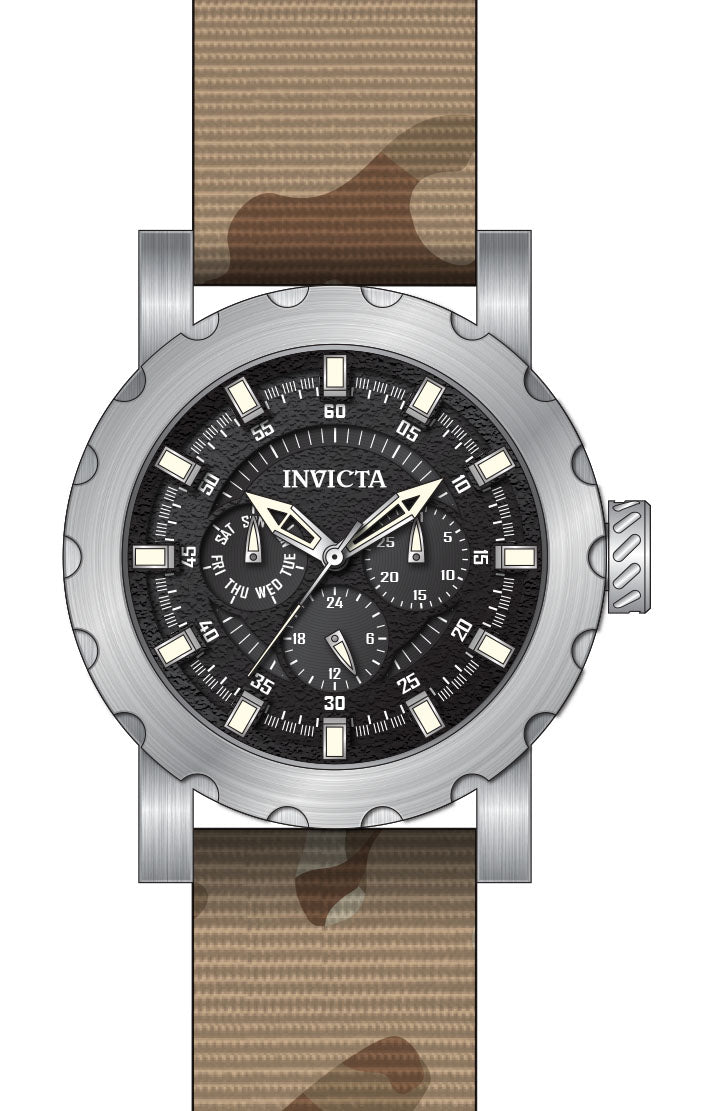 Band Material: Rifle, Band Tone: Brown,Camouflage, Band Width: 24MM, Band Length: 190MM, Crown Type: Push, Case Material: Stainless Steel, Case Tone: Steel, Case Size [mm]: 46.00, Case Back: Solid, Material of Hands: Metal, Color of Hands: Silver,Luminous, Crystal Type: Mineral, Bezel Material: Stainless Steel, Dial Material: Metal, Dial Color: Black, Dial Pattern: Textured Pattern .Purchasing these parts and having a non-authorized repair center open your watch voids all manufacturing warranties. Invicta cannot guarantee the quality standards of an altered timepiece, the standard 3-year limited warranty on Invicta timepieces shall be invalid if the timepiece is serviced at any time by an unauthorized repair center. This includes battery replacements, which must be done at an Invicta authorized repair center in order to maintain the eligibility of the warranty. Please follow the link below to learn more about Invicta's warranty.https://cdn.invictawatch.com/www/files/invicta-warranty-2018.pdf