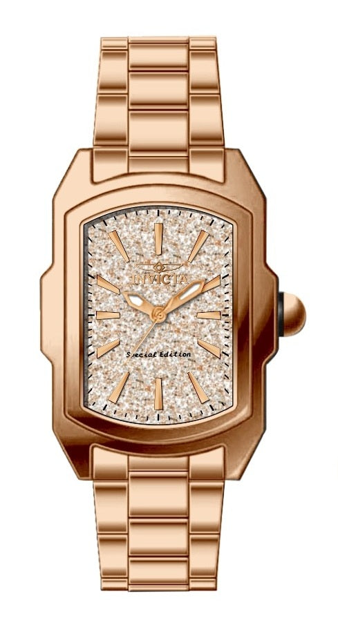 Band Material: Stainless Steel, Band Tone: Rose Gold, Band Width: 16MM, Band Length: 183MM, Crown Type: Push, Case Material: Stainless Steel, Case Tone: Rose Gold, Case Size [mm]: 29, Case Back: Solid, Material of Hands: Brass, Color of Hands: Rose Gold,Luminous, Crystal Type: Mineral, Bezel Material: None, Dial Material: Metal,Glitter, Dial Color: Rose Gold, Dial Pattern: Glossy Finish .Purchasing these parts and having a non-authorized repair center open your watch voids all manufacturing warranties. Invicta cannot guarantee the quality standards of an altered timepiece, the standard 3-year limited warranty on Invicta timepieces shall be invalid if the timepiece is serviced at any time by an unauthorized repair center. This includes battery replacements, which must be done at an Invicta authorized repair center in order to maintain the eligibility of the warranty. Please follow the link below to learn more about Invicta's warranty.https://cdn.invictawatch.com/www/files/invicta-warranty-2018.pdf