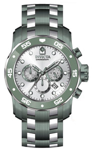 INVICTA Pro Diver Men 48mm Stainless Steel Light Green Silver dial VD53 Quartz , Band Material: Stainless Steel, Band Tone: Steel,Light Green, Band Size [mm]: 26, Band Length [mm]: 190, Buckle Type: Fold over safety , Crown Type : Push, Case Material : Stainless Steel, Case Tone : Light Green, Case Size (mm) : 48, Case Back : Solid, Material of Hands : Metal, Color of Hands : White,Light Green, Crystal Type : Flame Fusion, Bezel Material : Stainless Steel, Dial Material : Metal, Dial Color : Silver, Dial Pattern : Sun-ray Finish .Purchasing these parts and having a non-authorized repair center open your watch voids all manufacturing warranties. Invicta cannot guarantee the quality standards of an altered timepiece, the standard 3-year limited warranty on Invicta timepieces shall be invalid if the timepiece is serviced at any time by an unauthorized repair center. This includes battery replacements, which must be done at an Invicta authorized repair center in order to maintain the eligibility of the warranty. Please follow the link below to learn more about Invicta's warranty.https://cdn.invictawatch.com/www/files/invicta-warranty-2018.pdf