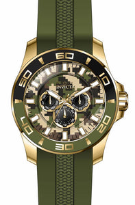 Band Material: Silicone, Band Tone: Olive Green, Band Width: 26MM, Band Length: 185MM, Crown Type: Push, Case Material: Stainless Steel, Case Tone: Gold, Case Size [mm]: 50, Case Back: Solid, Material of Hands: Metal, Color of Hands: Gold, Crystal Type: Flame Fusion, Bezel Material: Stainless Steel,Aluminum, Dial Material: Metal, Dial Color: Camouflage, Dial Pattern: Textured Pattern .Purchasing these parts and having a non-authorized repair center open your watch voids all manufacturing warranties. Invicta cannot guarantee the quality standards of an altered timepiece, the standard 3-year limited warranty on Invicta timepieces shall be invalid if the timepiece is serviced at any time by an unauthorized repair center. This includes battery replacements, which must be done at an Invicta authorized repair center in order to maintain the eligibility of the warranty. Please follow the link below to learn more about Invicta's warranty.https://cdn.invictawatch.com/www/files/invicta-warranty-2018.pdf