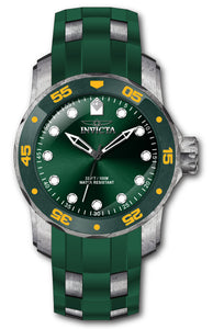 Band Material: Stainless Steel,Silicone, Band Tone: Steel,Green, Band Width: 26MM, Band Length: 200.25MM, Crown Type: Push, Case Material: Stainless Steel, Case Tone: Steel, Case Size [mm]: 48, Case Back: Solid, Material of Hands: Metal, Color of Hands: Gunmetal, Crystal Type: Flame Fusion, Bezel Material: Stainless Steel,Aluminum, Dial Material: Metal, Dial Color: Green .Purchasing these parts and having a non-authorized repair center open your watch voids all manufacturing warranties. Invicta cannot guarantee the quality standards of an altered timepiece, the standard 3-year limited warranty on Invicta timepieces shall be invalid if the timepiece is serviced at any time by an unauthorized repair center. This includes battery replacements, which must be done at an Invicta authorized repair center in order to maintain the eligibility of the warranty. Please follow the link below to learn more about Invicta's warranty.https://cdn.invictawatch.com/www/files/invicta-warranty-2018.pdf