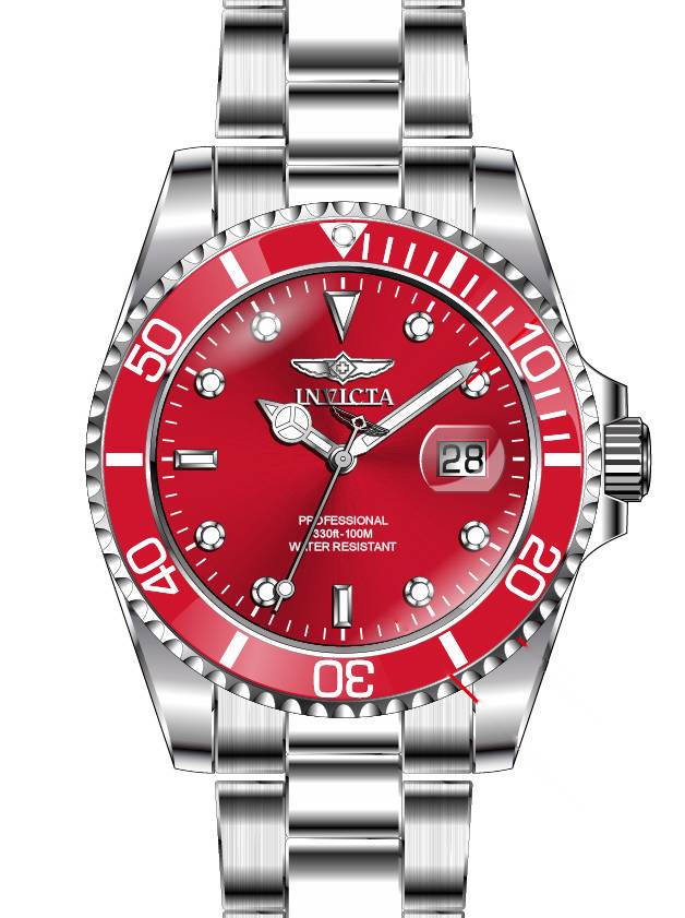 Band Material: Stainless Steel, Band Tone: Steel, Band Width: 20MM, Band Length: 180MM, Crown Type: Push, Case Material: Stainless Steel, Case Tone: Steel, Case Size [mm]: 40, Case Back: Solid, Material of Hands: Metal, Color of Hands: Silver, Crystal Type: Flame Fusion, Bezel Material: Stainless Steel,Aluminum, Dial Material: Metal, Dial Color: Red, Dial Pattern: None .Purchasing these parts and having a non-authorized repair center open your watch voids all manufacturing warranties. Invicta cannot guarantee the quality standards of an altered timepiece, the standard 3-year limited warranty on Invicta timepieces shall be invalid if the timepiece is serviced at any time by an unauthorized repair center. This includes battery replacements, which must be done at an Invicta authorized repair center in order to maintain the eligibility of the warranty. Please follow the link below to learn more about Invicta's warranty.https://cdn.invictawatch.com/www/files/invicta-warranty-2018.pdf