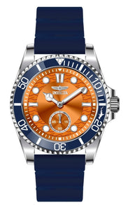 Band Material: Silicone, Band Tone: Blue, Band Width: 22MM, Band Length: 210MM, Crown Type: Screw Down, Case Material: Stainless Steel, Case Tone: Steel, Case Size [mm]: 43, Case Back: Solid, Material of Hands: Brass, Color of Hands: Silver,Luminous, Crystal Type: Mineral, Bezel Material: Stainless Steel,Aluminum, Dial Material: Brass, Dial Color: Orange, Dial Pattern: Sun-ray Finish .Purchasing these parts and having a non-authorized repair center open your watch voids all manufacturing warranties. Invicta cannot guarantee the quality standards of an altered timepiece, the standard 3-year limited warranty on Invicta timepieces shall be invalid if the timepiece is serviced at any time by an unauthorized repair center. This includes battery replacements, which must be done at an Invicta authorized repair center in order to maintain the eligibility of the warranty. Please follow the link below to learn more about Invicta's warranty.https://cdn.invictawatch.com/www/files/invicta-warranty-2018.pdf