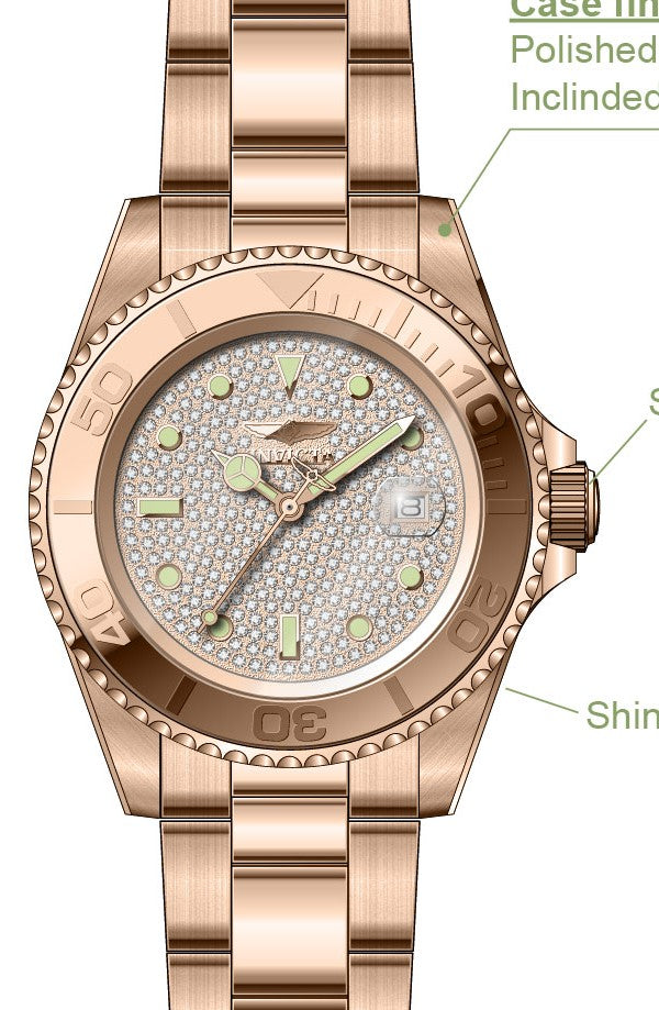 Band Material: Stainless Steel, Band Tone: Rose Gold, Band Width: 20MM, Band Length: 205MM, Crown Type: Screw Down, Case Material: Stainless Steel, Case Tone: Rose Gold, Case Size [mm]: 40, Material of Hands: Metal, Color of Hands: Rose Gold, Crystal Type: Mineral, Bezel Material: Stainless Steel, Dial Material: Metal, Dial Color: Rose Gold .Purchasing these parts and having a non-authorized repair center open your watch voids all manufacturing warranties. Invicta cannot guarantee the quality standards of an altered timepiece, the standard 3-year limited warranty on Invicta timepieces shall be invalid if the timepiece is serviced at any time by an unauthorized repair center. This includes battery replacements, which must be done at an Invicta authorized repair center in order to maintain the eligibility of the warranty. Please follow the link below to learn more about Invicta's warranty.https://cdn.invictawatch.com/www/files/invicta-warranty-2018.pdf
