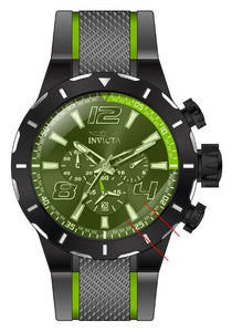 INVICTA S1 Rally Men 52mm Stainless Steel Black Green dial VD53 Quartz , Band Material: Silicone, Band Tone: Grey,Green, Band Size [mm]: 30, Band Length [mm]: 185.65, Buckle Type: Buckle , Crown Type : Push, Case Material : Stainless Steel, Case Tone : Black, Case Size (mm) : 52, Case Back : Solid, Material of Hands : Metal, Color of Hands : Silver, Crystal Type : Flame Fusion, Bezel Material : Stainless Steel, Dial Material : Metal, Dial Color : Green, Dial Pattern : Sun-ray Finish .Purchasing these parts and having a non-authorized repair center open your watch voids all manufacturing warranties. Invicta cannot guarantee the quality standards of an altered timepiece, the standard 3-year limited warranty on Invicta timepieces shall be invalid if the timepiece is serviced at any time by an unauthorized repair center. This includes battery replacements, which must be done at an Invicta authorized repair center in order to maintain the eligibility of the warranty. Please follow the link below to learn more about Invicta's warranty.https://cdn.invictawatch.com/www/files/invicta-warranty-2018.pdf