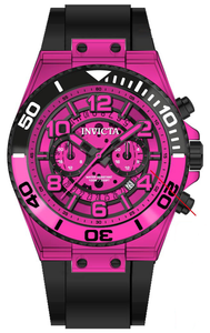 Band Material: Silicone, Band Tone: Black, Band Width: 30MM, Band Length: 210MM, Buckle Type: Buckle, Crown Type : Push, Case Material : Polyurethane, Case Tone : Pink, Case Size [mm] : 48, Case Back : Solid, Material of Hands : Metal, Color of Hands : Black,Pink, Crystal Type : Flame Fusion, Bezel Material : Stainless Steel, Dial Material : Stainless Steel, Dial Color : Pink, Dial Pattern : Sun-ray Finish .Purchasing these parts and having a non-authorized repair center open your watch voids all manufacturing warranties. Invicta cannot guarantee the quality standards of an altered timepiece, the standard 3-year limited warranty on Invicta timepieces shall be invalid if the timepiece is serviced at any time by an unauthorized repair center. This includes battery replacements, which must be done at an Invicta authorized repair center in order to maintain the eligibility of the warranty. Please follow the link below to learn more about Invicta's warranty.https://cdn.invictawatch.com/www/files/invicta-warranty-2018.pdf