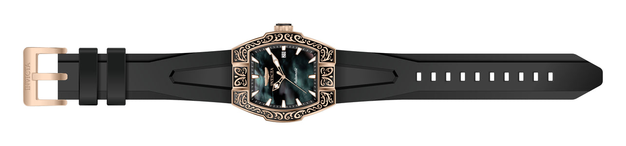 Band Material: Silicone, Band Tone: Black, Band Width: 26MM, Band Length: 210MM, Crown Type: Push, Case Material: Stainless Steel, Case Tone: Rose Gold, Case Size [mm]: 44, Case Back: Exhibition, Material of Hands: Metal, Color of Hands: Rose Gold,Luminous, Crystal Type: Flame Fusion, Dial Material: Mother of Pearl, Dial Color: Black, Dial Pattern: None .Purchasing these parts and having a non-authorized repair center open your watch voids all manufacturing warranties. Invicta cannot guarantee the quality standards of an altered timepiece, the standard 3-year limited warranty on Invicta timepieces shall be invalid if the timepiece is serviced at any time by an unauthorized repair center. This includes battery replacements, which must be done at an Invicta authorized repair center in order to maintain the eligibility of the warranty. Please follow the link below to learn more about Invicta's warranty.https://cdn.invictawatch.com/www/files/invicta-warranty-2018.pdf