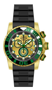 Band Material: Silicone, Band Tone: Black, Band Width: 28MM, Band Length: 220MM, Crown Type: Screw Down, Case Material: Stainless Steel, Case Tone: Gold, Case Size [mm]: 52, Case Back: Solid, Material of Hands: Brass, Color of Hands: Black,Green,Luminous, Crystal Type: Mineral, Bezel Material: Stainless Steel,Aluminum,Luminous, Dial Material: Brass, Dial Color: Gold, Dial Pattern: Sun-ray Finish .Purchasing these parts and having a non-authorized repair center open your watch voids all manufacturing warranties. Invicta cannot guarantee the quality standards of an altered timepiece, the standard 3-year limited warranty on Invicta timepieces shall be invalid if the timepiece is serviced at any time by an unauthorized repair center. This includes battery replacements, which must be done at an Invicta authorized repair center in order to maintain the eligibility of the warranty. Please follow the link below to learn more about Invicta's warranty.https://cdn.invictawatch.com/www/files/invicta-warranty-2018.pdf