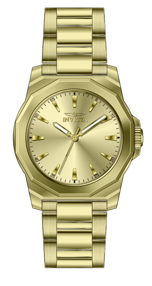 Band Material: Stainless Steel, Band Tone: Gold, Band Width: 18MM, Band Length: 170MM, Crown Type: Push, Case Material: Stainless Steel, Case Tone: Gold, Case Size [mm]: 34, Crystal Type: Flame Fusion, Dial Material: Brass, Dial Color: Gold .Purchasing these parts and having a non-authorized repair center open your watch voids all manufacturing warranties. Invicta cannot guarantee the quality standards of an altered timepiece, the standard 3-year limited warranty on Invicta timepieces shall be invalid if the timepiece is serviced at any time by an unauthorized repair center. This includes battery replacements, which must be done at an Invicta authorized repair center in order to maintain the eligibility of the warranty. Please follow the link below to learn more about Invicta's warranty.https://cdn.invictawatch.com/www/files/invicta-warranty-2018.pdf